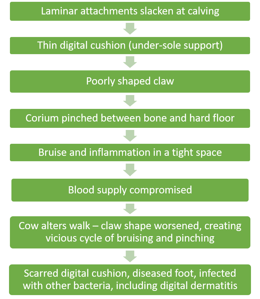 Changes in the foot leading to a sole ulcer typically occurs around calving. This is when laminar attachments in the hoof capsule slacken, allowing P3 to ‘sink’, the flexor tuberosity creates a pinch point between P3 and the ground. Thus compressing the solar corium, disrupting blood flow to keratinocyte cells that produce solar horn. This then produces bruising and inflammation and disrupts sole horn growth. Cows will alter gait to account for the inflammation and claw horn shape is affected, creating a vicious cycle of pinching and bruising. If the pressure is not alleviated then a sole ulcer develops. It takes 2 months for injury at the corium to be seen on the sole, due to sole horn growing roughly 5mm a month. Sole ulcers can be remembered as ‘standing up disease’ due to most of the associated risk factors cause cows to stand for long periods of time.